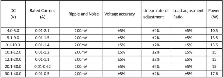 2. Ripple and noise measurement method: 0.1uF and 10uF capacitors are connected in parallel at the terminal, and measurements are performed at a 20MHz bandwidth.